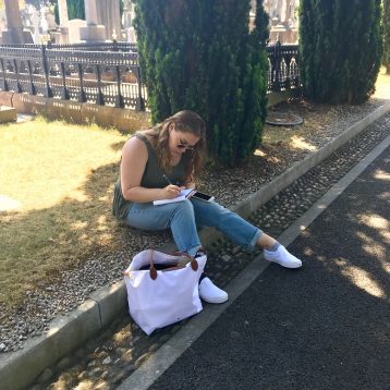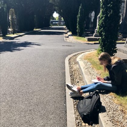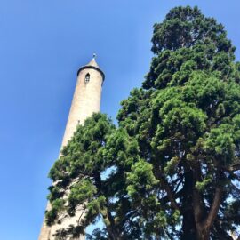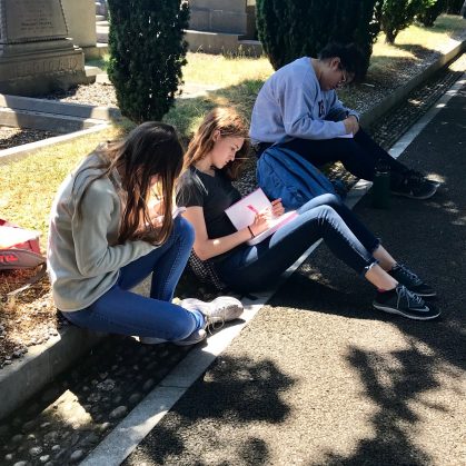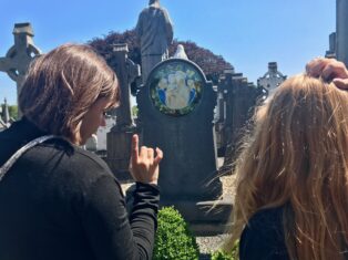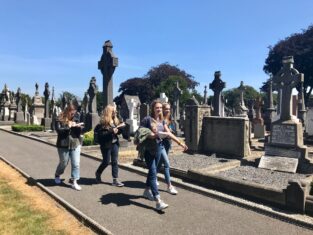 This morning we set out for Glasnevin Cemetery, Dublin’s “dead city,” brimming with over 1.5 million resting residents. Among them are Daniel O’Connell (whose grave students were invited to touch briefly for good luck), Charles Parnell (who’s buried in a mass cholera pit as per his final wish to be interred among Ireland’s poor), Maude Gonne (inspiration of many an unrequited W. B. Yeats poem), and Irish nationalist hero Michael Collins (whose grave sits seven stones over from his former fiancée, Kitty Kiernan). After a blistering tour of this historic spot, we picnicked under the yew trees and took on a couple of site-specific writing exercises. It was an absolutely beautiful day to wander among the stones and feel lucky to visit here, and doubly so to be able to leave.